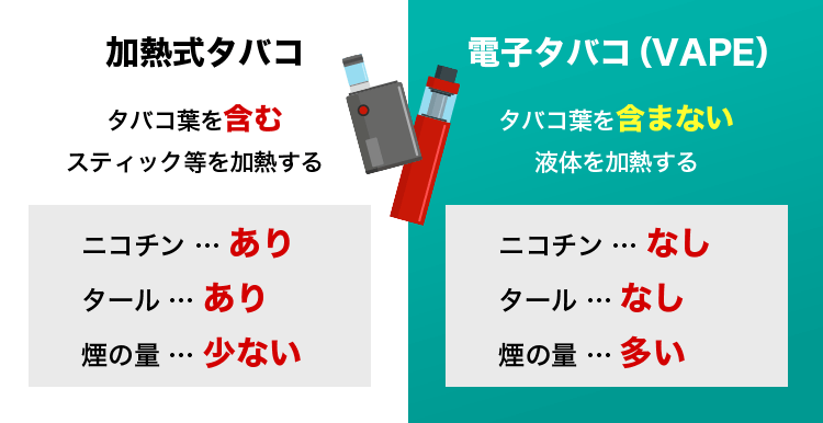 電子タバコはタバコ葉を使用せず、液体を加熱して蒸気を生成するのに対し、加熱式タバコはタバコ葉を加熱して蒸気を生成します。