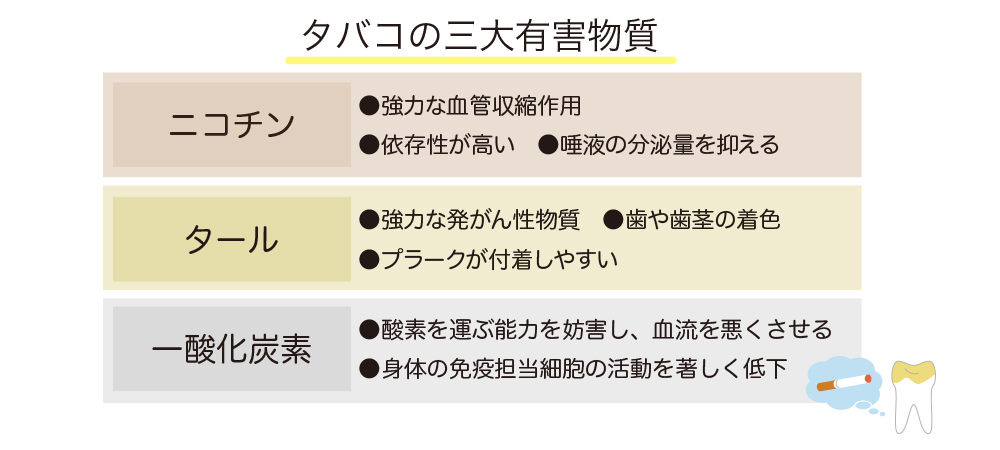 口は、体の中で最初に喫煙の影響を受ける部分です。たばこの煙や成分は、口の中に入ると粘膜や歯ぐきから吸収されます。吸収されたたばこの有害物質は、血管を収縮し、歯ぐきの血流量を減少させます。血液循環が悪化して歯ぐきに十分な酸素がいきわたらなくなると、歯周ポケットの中で歯周病の原因となる細菌が繁殖しやすくなります。細菌が産生する毒素は歯周ポケットをさらに深めるとともに歯を支える骨を溶かしていきます。