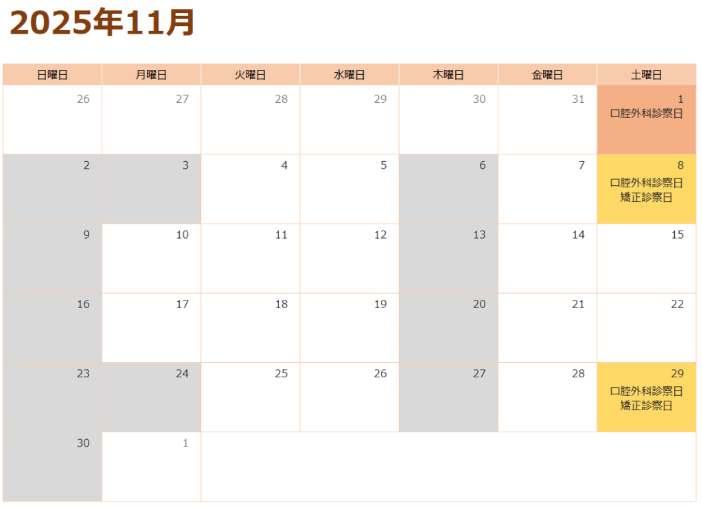 梶川先生による親知らずの抜歯など口腔外科の診察日11/1(土)、11/8(土)、11/29(土)となっております。