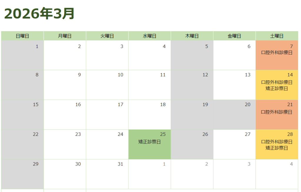 梶川先生による親知らずの抜歯など口腔外科の診察日3/7(土)、3/14(土)、3/21(土)、3/28(土)となっております。